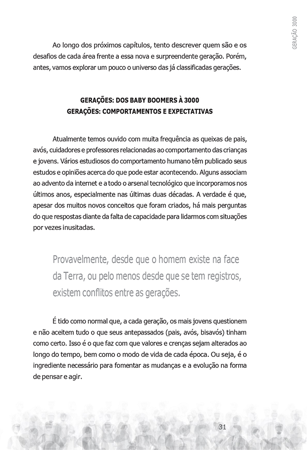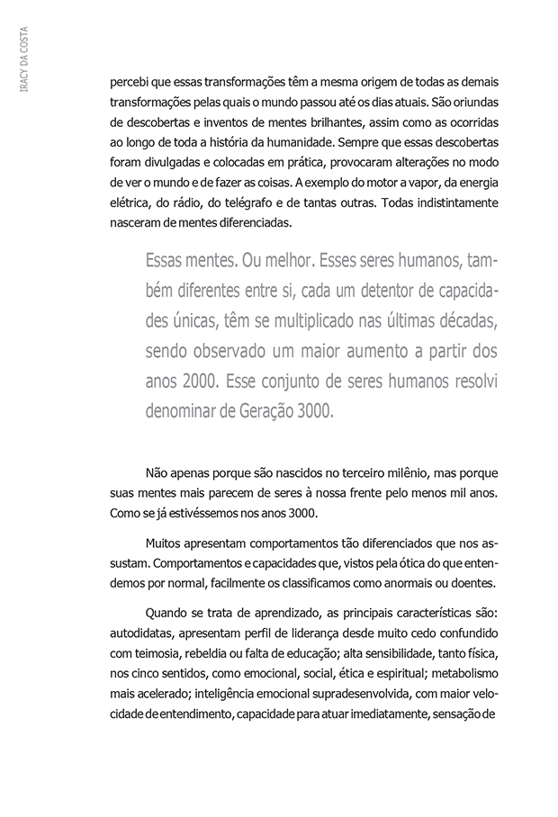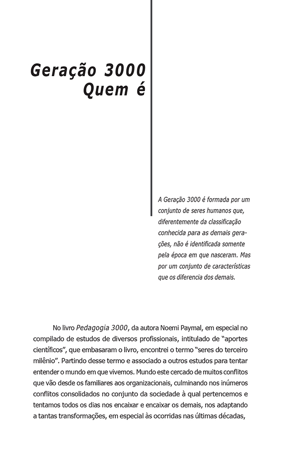 “Geração 3000” oferece uma visão única e perspicaz sobre as novas gerações, suas capacidades incomuns e como elas estão moldando o mundo. É uma leitura essencial para qualquer pessoa que queira entender e se conectar com essas gerações.